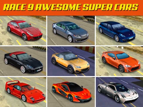 Your racing skills will be tested in 3 fantastic locations: A city by night, secret military base and a desolated desert. On top of that we’ve laid out 9 most famous super cars! The majority of them are mid engine, turbo charged, asphalt ripping beasts! Getting them under control will definitely be a huge challenge!