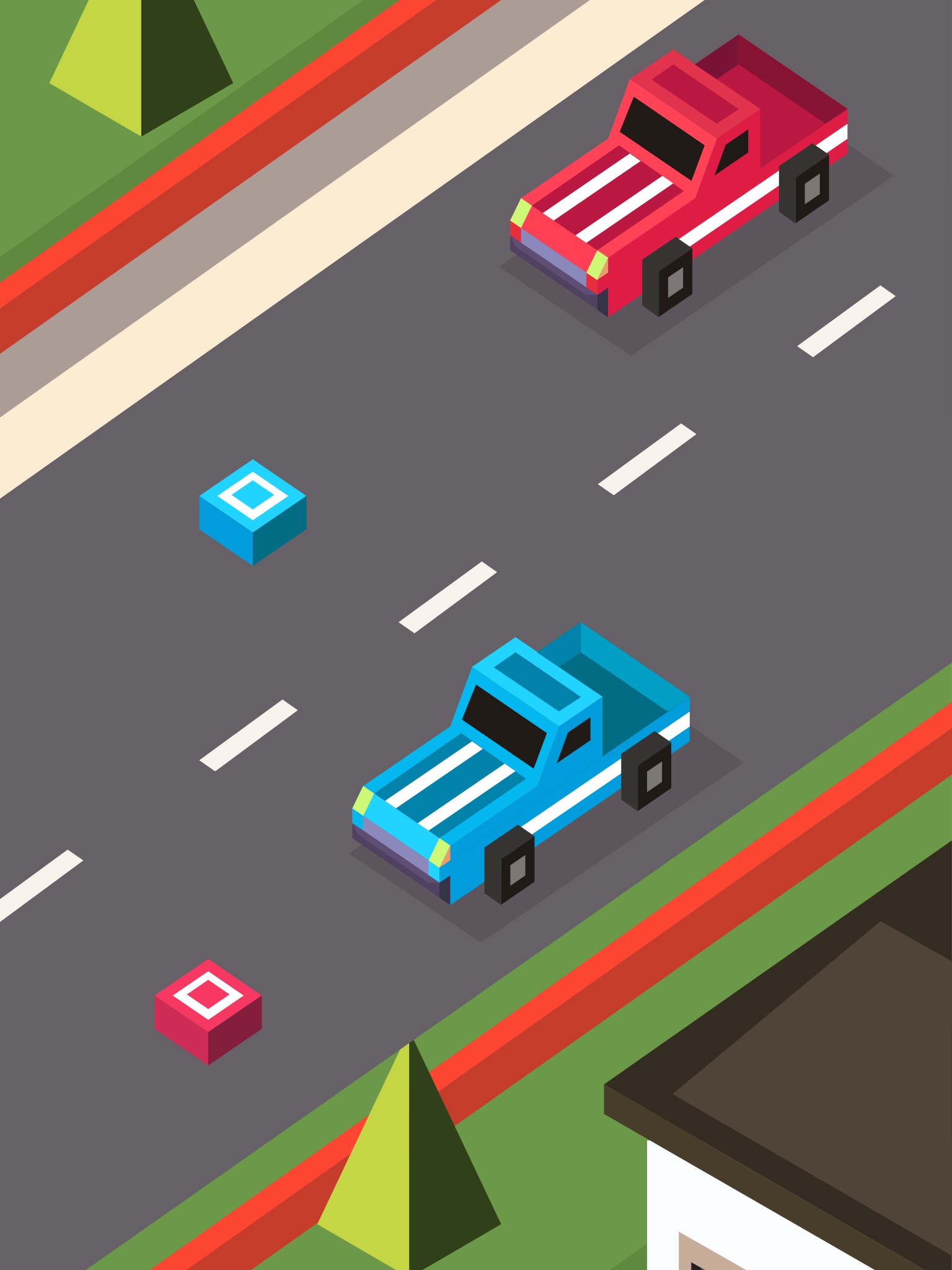 Control the red car and the blue car at the same time. Collect all the circles and avoid the squares on the road.