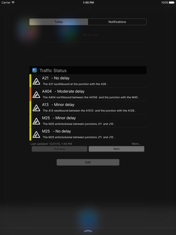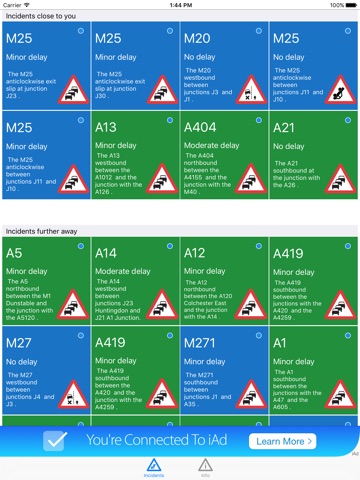 Clear colour coded tiles showing the key information, Road number, delay, type of incident and lanes closed and to get more details simply click a tile and you can read the full incident description, or why bother? press the speak button to have it read out to you!