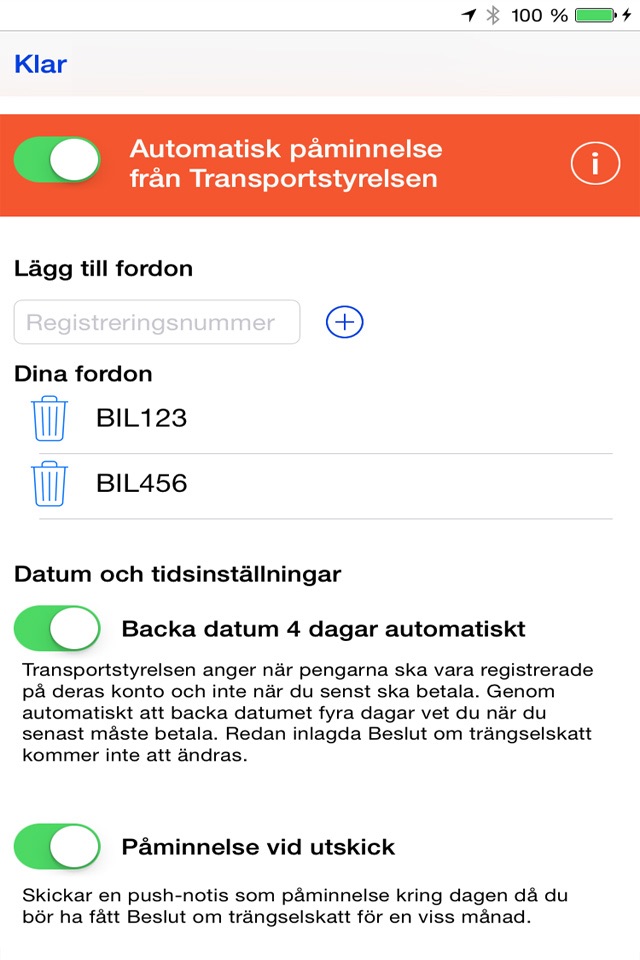 I appen kan du ställa in vilken tid du vill ha push-notiserna och automatiskt justera datumet så att du ser sista betalningsdag istället för dagen betalningen måste vara registrerad hos Transportstyrelsen. Du kan också ställa in om du vill ha påminnelse kring de dagar fakturan (Beslut om trängselskatt) skall ha skickats ut.