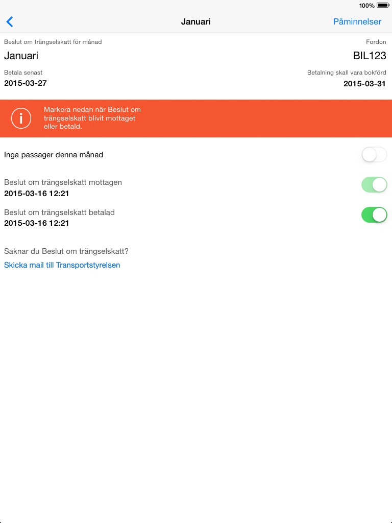 Appen skapar automatiskt fakturor (eller Beslut om trängselskatt som de egentligen heter) månadsvis och när du sen får fakturan (Beslut om trängselskatt) i din brevlåda markerar du i appen att den är mottagen och en vecka innan sista betalningsdag börjar appen skicka push-notiser dagligen till dej om du inte har betalt.
