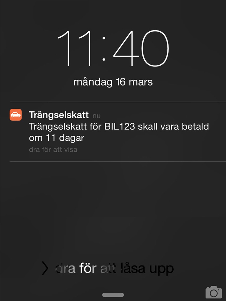 Full koll på din trängselskatt! Med vår app får du push-notiser som påminner dej om du inte har betalat din trängselskatt i tid och du undviker att få tilläggsavgiften på 500 kronor. Du kan också köpa till en finfin tjänst "Automatisk påminnelse" och för endast 29kr i engångskostnad får du en påminnelse av självaste Transportstyrelsen innan sista betalningsdagen direkt till din e-post. Hur gött är inte det?