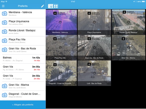 - Favourites: on the map the cameras that the user has added as favourites appear in a different colour so they are able to access them more quickly. In the favourites section the cameras can be viewed in a grid format.