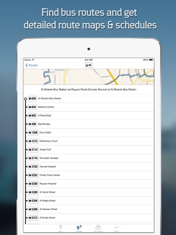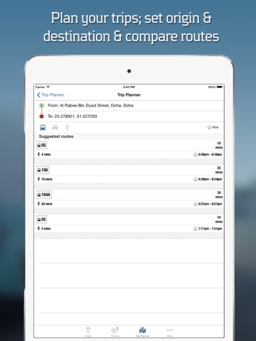 Find bus stops and metro stations and upcoming arrivals near you; explore bus routes and metro lines, and plan your navigation across Qatar. Contains comprehensive information about Doha/Qatars public bus and metro services including routes, stops, maps and timetables/schedules. Also has an integrated trip/journey planner with location search functionality to help you figure out the most efficient routes to reach your destination with the expected duration of travel.