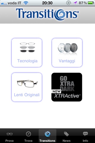 Applicazione dedicata alla ricerca di un negozio rivenditore di lenti Transitions, e informazioni sulla tecnologia delle lenti.