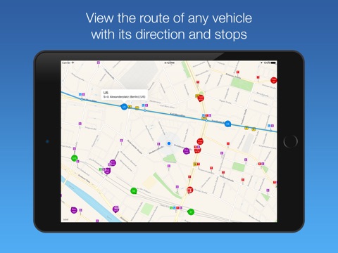 TransitTracker provides a map to track public transportation. All buses, trams, subways and suburban trains in the Berlin area are supported. The vehicles move in real-time and all stops are marked on the map. Additionally the route of any vehicle can be highlighted.