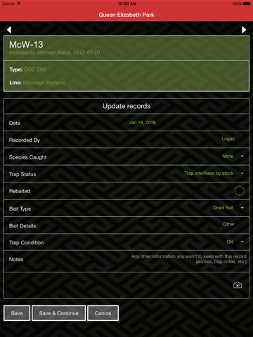 The Trap.NZ app is designed to work with your Trap.NZ account to help you keep a record of your trapping efforts directly from your mobile. You can locate new traps and bait stations using your devices GPS and record data as you check your traps. The app works off-line and out of network coverage - you can upload records when you are back in coverage.