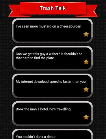 Need help Trash Talking? Trash Talk app is a collection of the best funny trash talk lines for all all sports including fantasy football trash talk, basketball, baseball, and hockey. Hecklers, do you need help heckling fans, players and referees? Learn the fine art of talking trash, smack talk and comebacks! If you are looking for good trash talk quotes to improve your trash talking game, download this free app.
