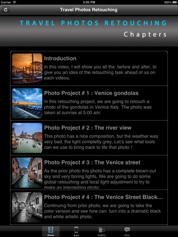 This app will provide you 6 videos of 6 different retouching project from start to finish to get the maximum out of your travel photography. Sometime we travel far away and the weather is not liked we hoped, I will show you how to use Lightroom 4 to retouch your photos and make them a lot of more interesting.