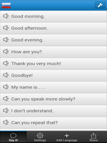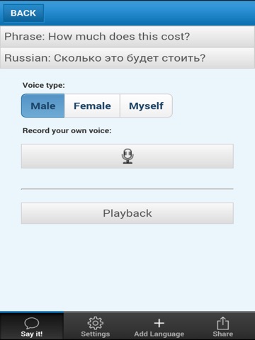 Enable the desired language package before heading to your vacation or business destination. Playback the translated phrases when you need them, even when your phone is off-line.