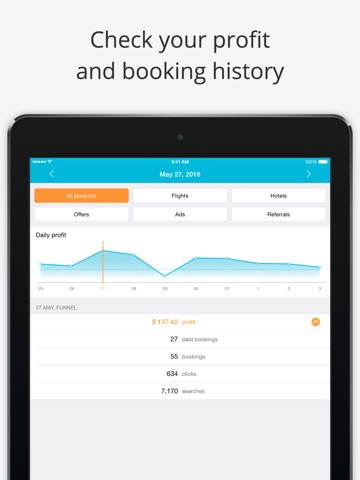 With the Travelpayouts mobile app, you can conveniently track statistics on searches, clicks, and sales. The application provides both general and detailed information on a specific brand for the selected period.