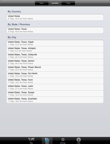 TravelStats helps you keep track of where you have been, how you got there, and the distance you have travelled. Use built-in GPS to add locations. Set the travel type (business, commute or non-business) and travel method (air, automobile, boat, walk, motorcycle, bus, or train).