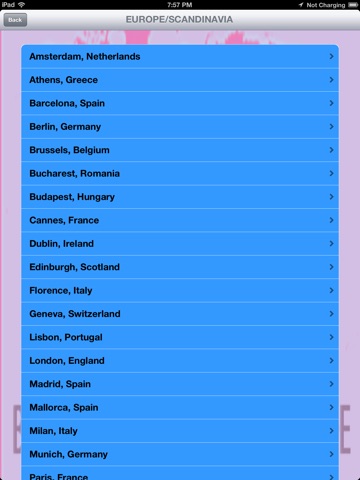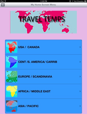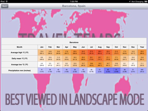 Do you like to plan your vacations months in advance? Do you often wish to know whats the average temperature and precipitation at your destination in the time frame youre considering? Or do you only have a certain window of dates to plan and wish to find a destination where the temperature at that time is to your liking? Then TravelTemps is for you. The top 102 travel destinations are listed, reached by menus that begin with 5 major geographic areas. In each of these areas are numerous destinations and when you touch one, a table will appear with the pertinent information. Once you are done, just touching the BACK button in the upper left will bring you right back to the previous screen in the app for further investigation. Easy to use and faster than internet searches.