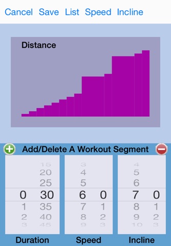 ◆ The lower region of the workout creation screen has three pickers: Duration, Speed, and Incline