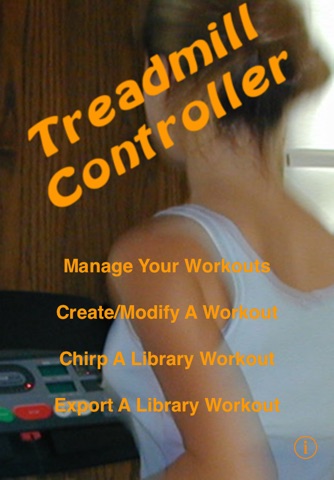 When the program starts you see a splash screen with an info-button that tells you about the App and four menu-buttons: "Manage Your Workouts", "Create/Modify A Workout", "Chirp A Library Workout" and "Export A Library Workout".