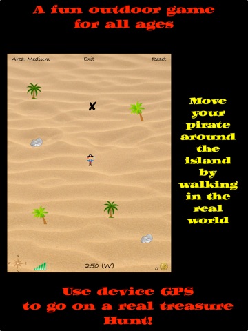 Find a safe open area e.g. a big field or park and position yourself in the middle. As you walk around in the real world the little fellah on screen walks in the same direction. Go and get the treasure you see marked by the X. Keep collecting and see how much you can get over time.