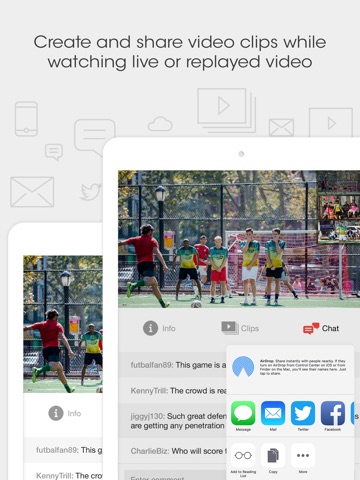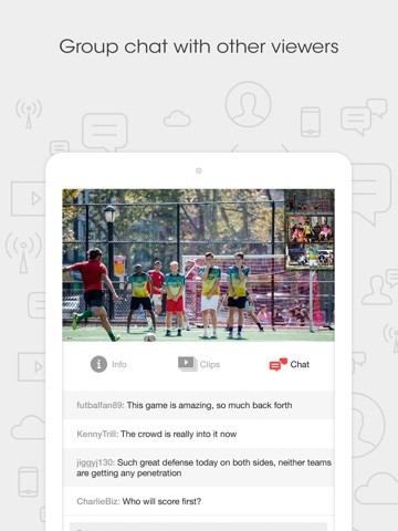 Browse and follow channels to find content that piques your interest. Comment, clip and share video in realtime during live or on-demand events. All clips are timestamped bookmarks and sharable via SMS, email or connected social accounts like Facebook and Twitter. Live chat with a group of users while watching the live stream.