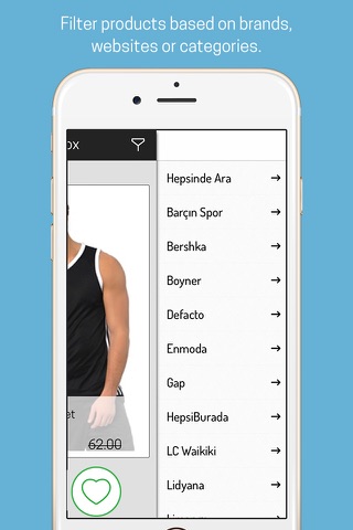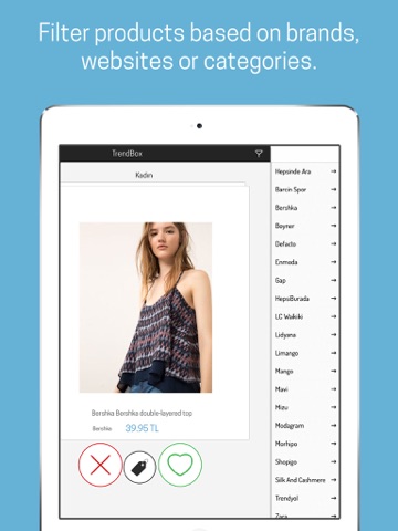 TrendBoxs filter system allows you to find what you want between hundred of thousands products. You can choose categories between women, men, clothing, accessories, shoes, and much more or you can swipe between all products of your favorite brand or store.
