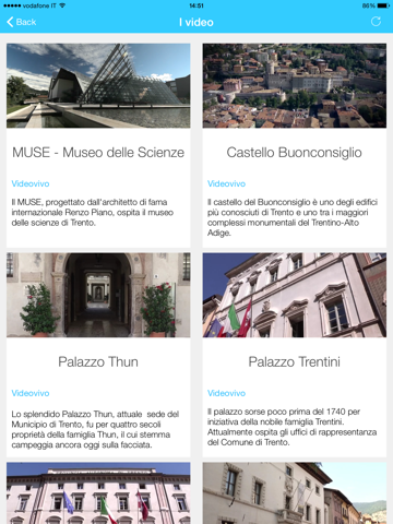 I video sono relativi a Castello del Buonconsiglio, il Museo delle Scienze MUSE, lo spazio archeologico sotterraneo del S.A.S.S., Palazzo Thun, Palazzo Trentini e Palazzo Roccabruna, la Cattedrale di San Vigilio, il Museo Diocesano, Piazza Duomo e la Sala Depero.