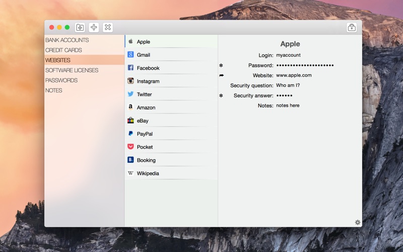 • Standard categories like Bank Accounts, Credit Cards, Websites, Software Licenses, Passwords, Notes.