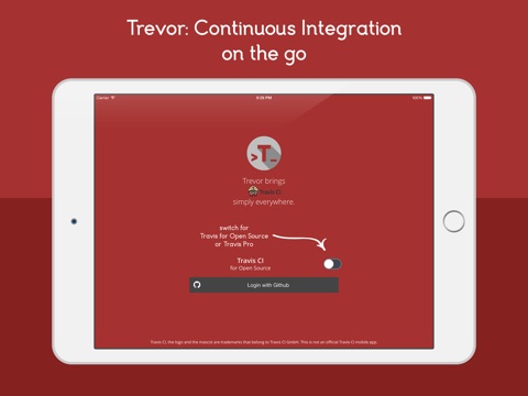 Trevor is a mobile application that brings Travis CI straight to your phone or tablet. Once you have download it, select whether you want to access "Travis CI for Open Source" or "Travis Pro" and Login with Github.