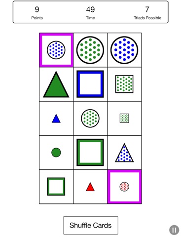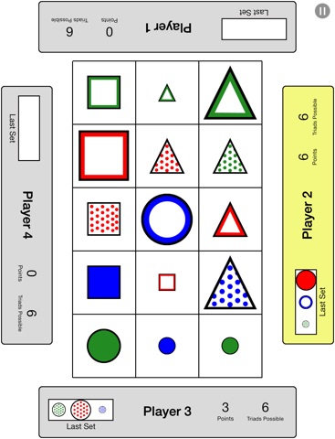The goal of this game is to find triads as quickly as possible. Whats a triad? Well, each card has four attributes (size, color, shape, and pattern). Each attribute has three possible states.