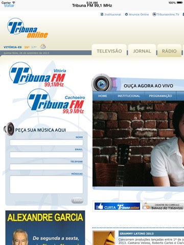 A rádio Tribuna FM 99,1 MHz agora está disponivel em seu iPhone, iPad e iPod. Ouça sua ráido predileta, veja nossas redes sociais e nosso site e entre em contato conosco através do aplicativo. Você que mora em Vitória-ES não pode deixar de ter esse aplicativo.