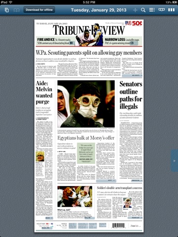 The Tribune-Review eTRIB is an exact digital replica of the award-winning Tribune-Review - Western PA’s premier source for news, sports, politics, entertainment and more. As a subscriber you can enjoy the entire print edition right from your iPad or mobile device, anywhere you have an internet connection, or download the issues you want and take them on the go.