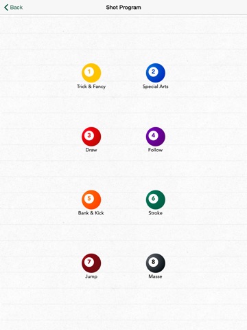 For more detailed instructional material, please visit www.trickshottim.com, the website of professional trick shot artist Tim “The Dragon” Chin. He is a consultant on this app and is dedicated to teaching trick shots. You can sign up for a weekly trick shot tutorial newsletter (and get a free download!) on his website or drop him a message at [email protected].