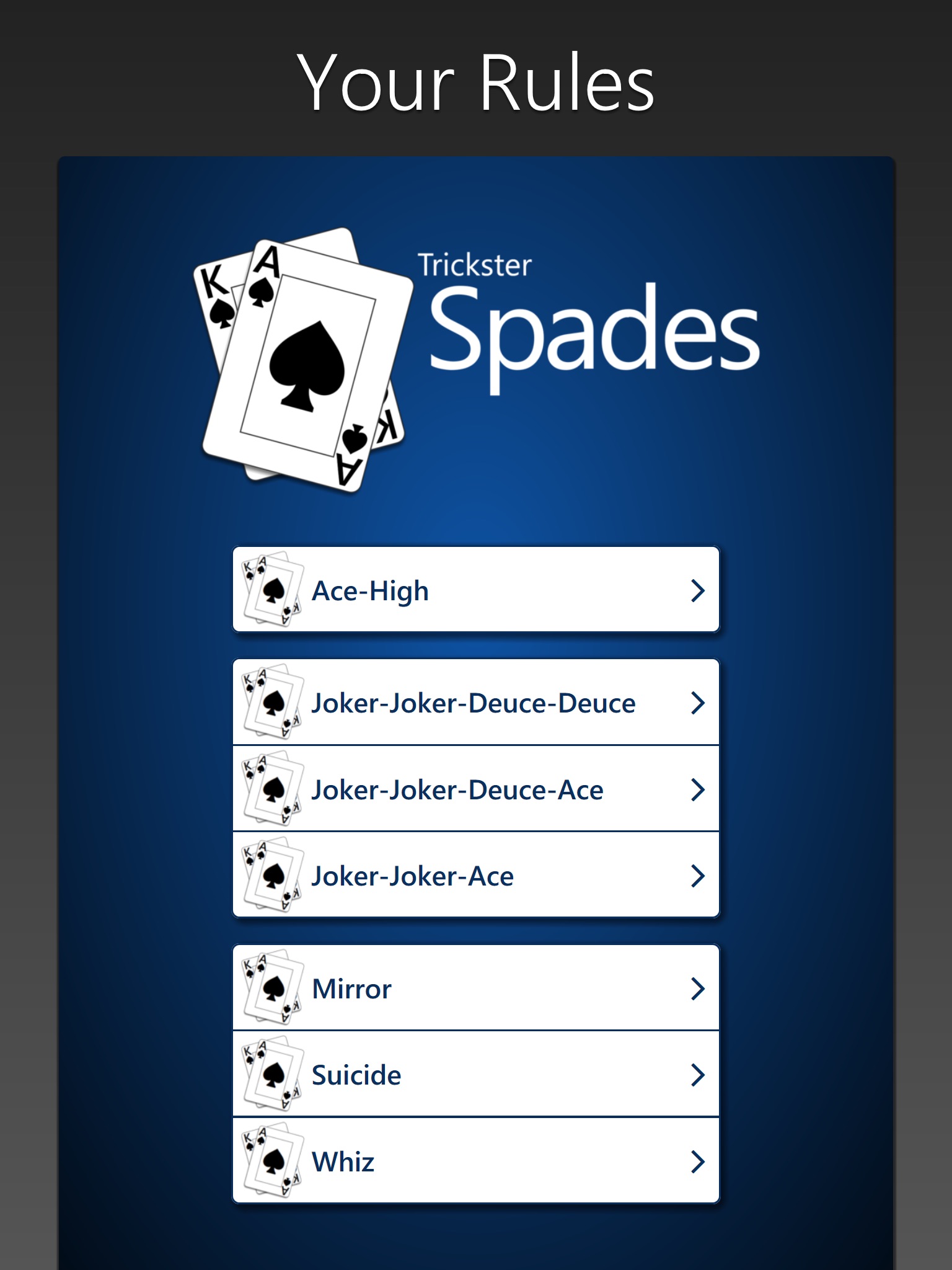 Enjoy Spades, Euchre, Pitch, Hearts, Bid Whist, 500, Pinochle, Oh Hell, or Bridge. Trickster Cards supports them all with customizable rules to play the way you want to play.