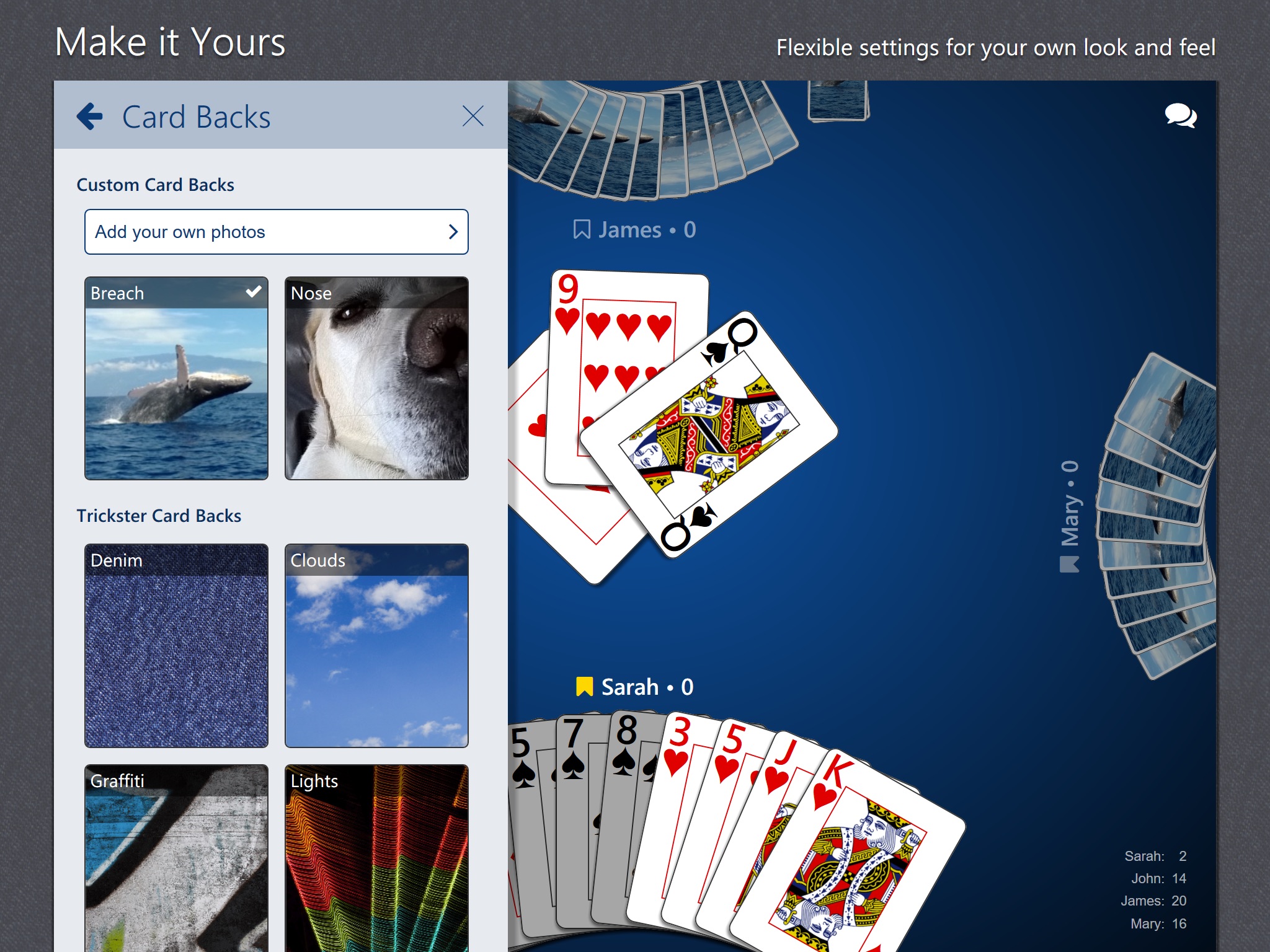 Play Hearts your way with customizable rules. Play individual or partnership, adjust the value of the Queen of Spades and Jack of Diamonds, tailor scoring when players “Shoot the Moon,” and more.