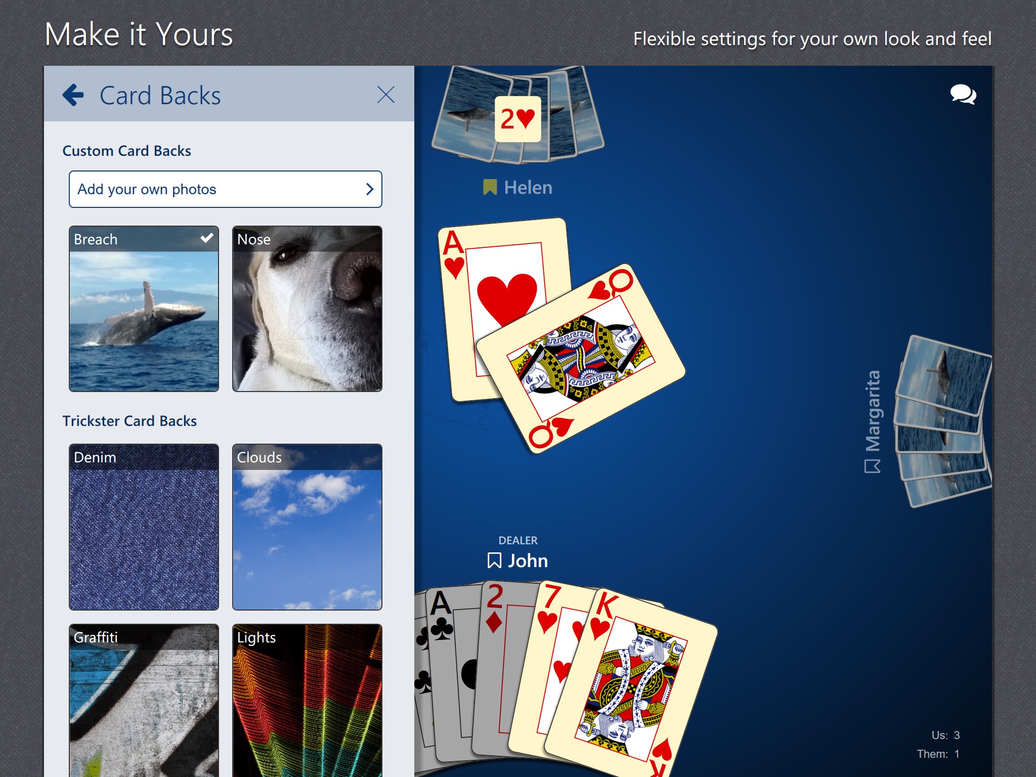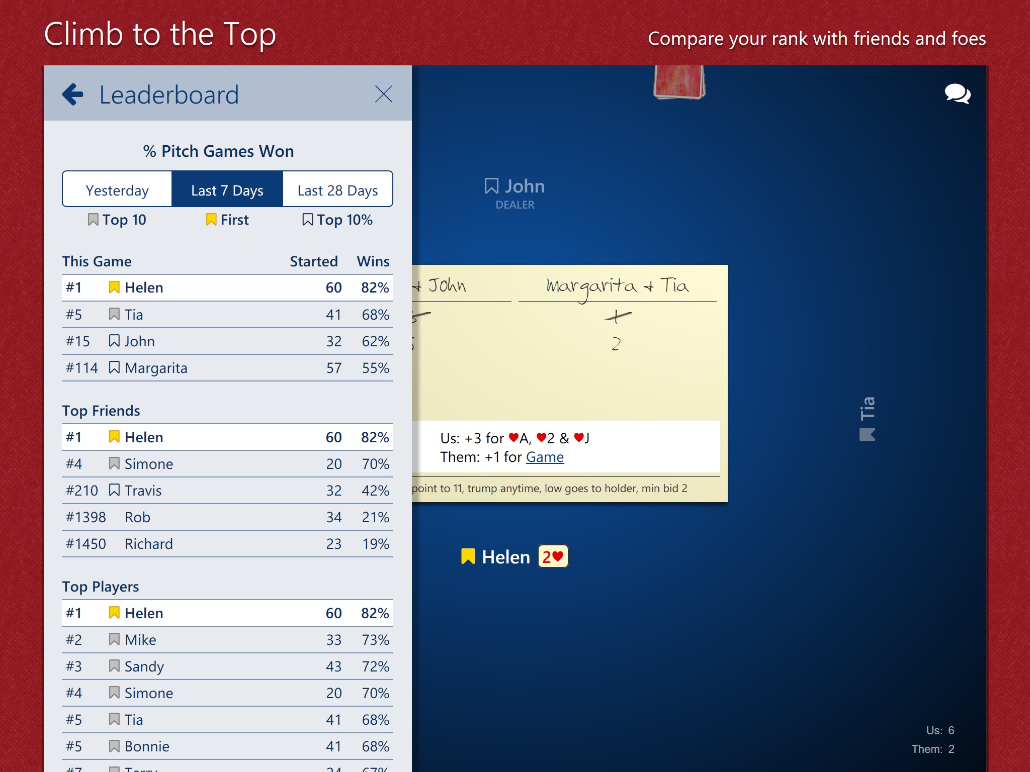 Play Pitch your way with customizable rules. Choose your favorite point variation, adjust who gets low point, decide if players can “Shoot the Moon,” and more.