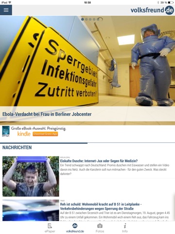 Lesen Sie den Trierischen Volksfreund auf Ihrem iPad oder iPhone: Mit der TV-App haben Sie überall Zugriff auf die Inhalte des Trierischen Volksfreunds in der vertrauten Optik als ePaper der gedruckten Zeitung und darüber hinaus können Sie sich topaktuell über die wichtigsten Nachrichten aus der Region Trier, Eifel, Saar, Mosel und Hunsrück informieren.