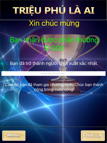 "Triệu Phú Là Ai" là một chương trình trò chơi trí tuệ giải trí thú vị. Với hàng vạn câu hỏi phong phú đa dạng trên nhiều lĩnh vực, giao diện chương trình đẹp mắt, âm thanh sống động, huy vọng chương trình sẽ đem lại cho bạn những phú giây giải trí thú vị.