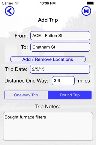 After setting up your locations it only takes a few quick picks you can add a trip to your log.
