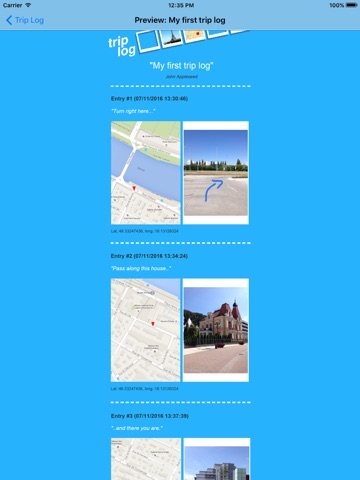 With this app you can easily create trip logs. A trip log is a sequence of log entries. A log entry can contain location, a picture (with a possibility of drawing with fingers) and a text comment. You can add several log entries to a trip log during your trip or later on. Once you have added an entry, it cannot be modified (this can be used for documentation purposes).
