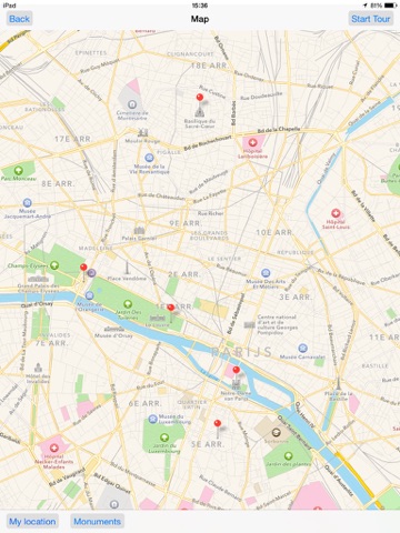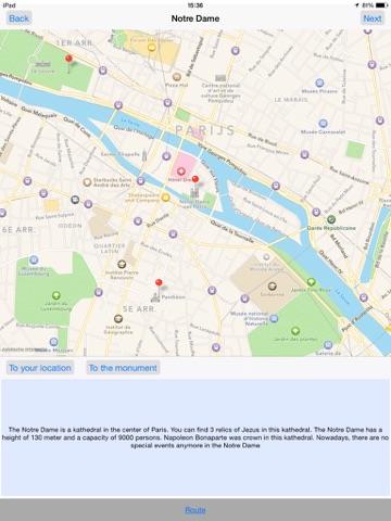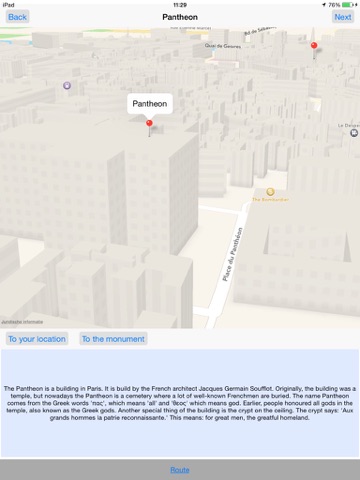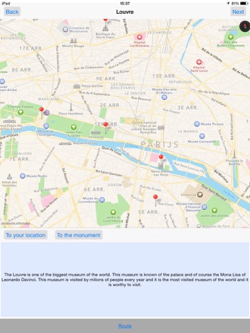This app provides you a tour through Paris. If you follow this tour, you will visit some sights. With the travelling plans, you can easily go to each sight.