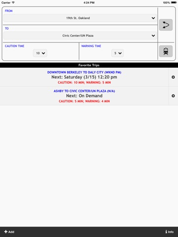 • Tap the plus button to add a favorite trip or daily commute, customizing the stations, the caution/warning times, the days/times to automatically load and display the schedule.