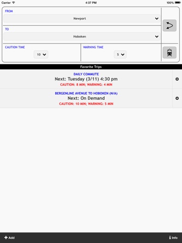 • Tap the plus button to add a favorite trip or daily commute, customizing the stations, the caution/warning times, the days/times to automatically load and display the schedule.