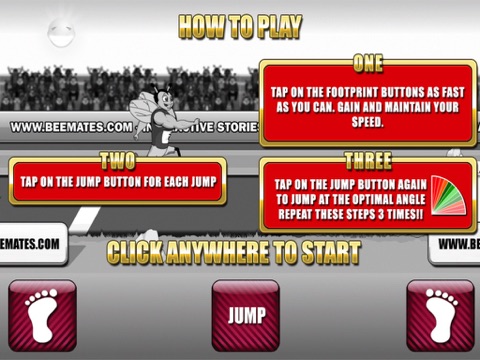 Triple Jump Hero is one of the most exciting game there is! This simple game is so captivating, you cant stop playing, so make sure you eat a full mean before playing this. Like all racing game, the goal is to win the race. To accomplish this, you need to tap on the footprint buttons as fast as you can to gain and maintain your speed. Then, tap on the jump button for each jump. Tap on the jump button again to jump at the optimal angle, you can do this three times to win the game! This sounds elementary, but it wont be easy, Im telling ya! Through online you can check how you are doing compared to your friends, and the rest of the world.