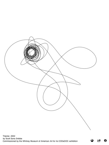 Tripolar animates the tangled, abstract, and ever-changing forms a pendulum makes as it swings over a magnetic base. It was commissioned by the Whitney Museum of American Art in New York. The drawings it creates, reminiscent of 1950s abstraction, are chaotic systems in which minute changes to the start position produce large changes in the pendulum’s path. By invisibly moving the starting position in microscopic increments towards your fingers position, Tripolar lets you explore points between pixels, simulating a resolution thousands of times that of the actual screen.