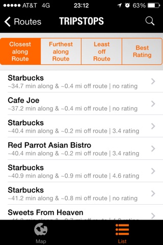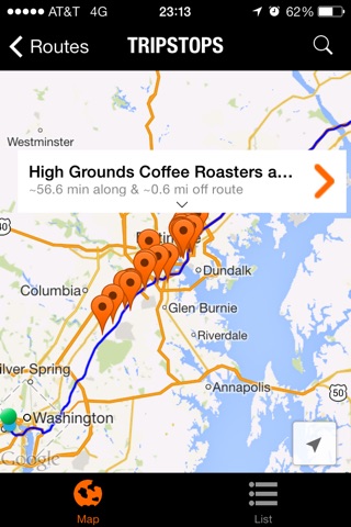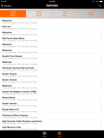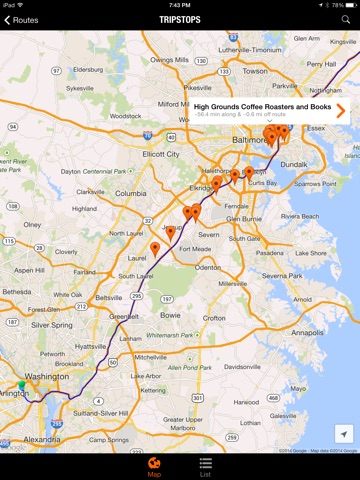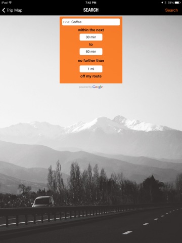 Download TRIPSTOP to find places of interest within a range of minutes (or miles or kilometers) along your route and no further than some distance off your route! Simply tell the app your destination, pick your route, specify where and when you want to stop, and then get directions to your chosen TRIPSTOP.