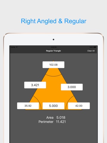 An extraordinarily user friendly application for your convenience to solve all your triangle related problems for FREE! Solve either right angled triangles or regular triangles by navigating between the tabs!