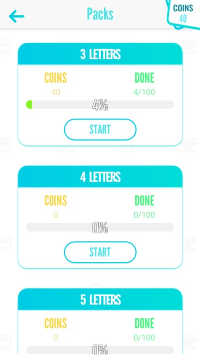 The game contains packs containing words with 3 letters, 4 letters, 5 letters, et cetera.