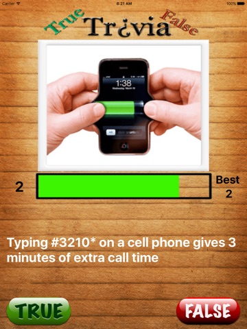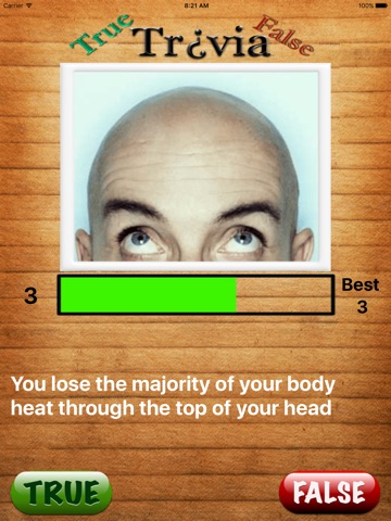 Game play is easy. Just indicate TRUE or FALSE when presented with a fact. After the result is given, the NEXT button appears to go on to the next fact.