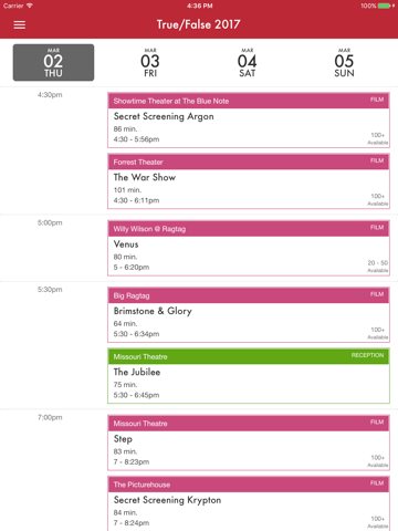 The official app of the True/False Film Fest. This app provides an easy way to keep track of your T/F schedule, coordinate with your friends, and learn more about the True/False films, parties, concerts, art installations, synapses, news, and venues. There is also a local restaurant guide.