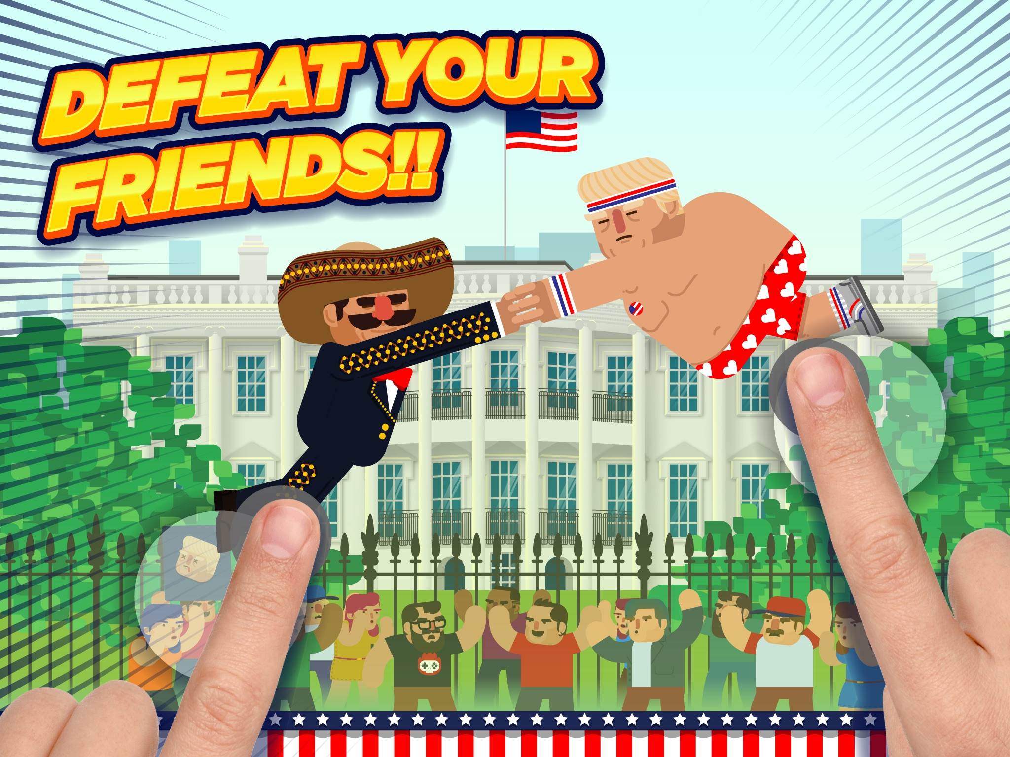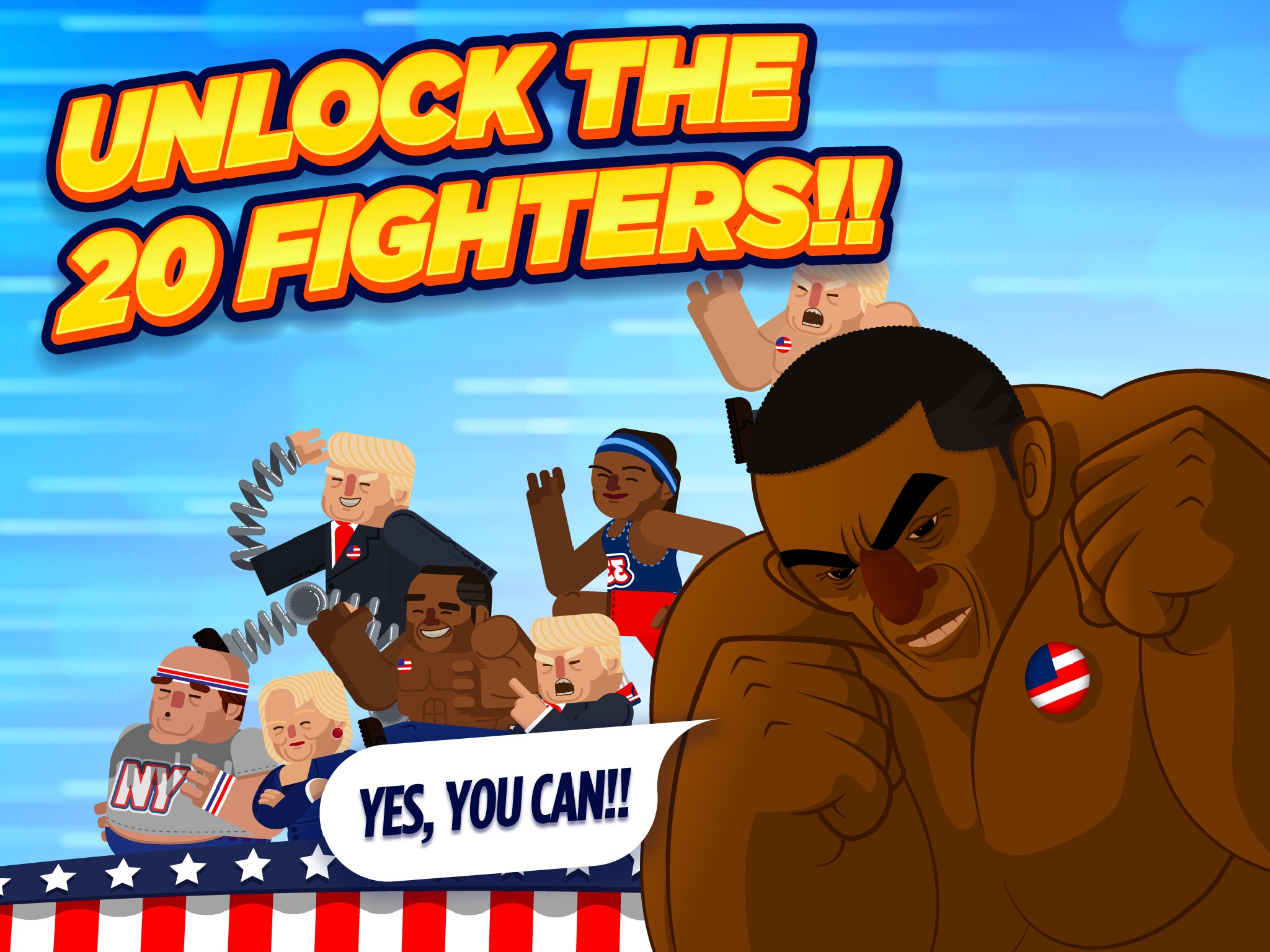 Are you a democrat or a republican? It doesn’t matter! Fight with or against Donald Trump or one of its many versions, or choose Barack Obama, Hillary Clinton, Johnson the rapper, Clovin the Irishman, Frank the obese, Pancho the Mexican mariachi… And so on up to 20 powerful fighters. Will you be able to unlock them all?