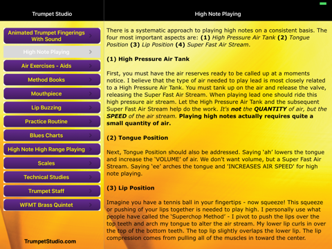 Trumpet Studio has a little in it for every level of trumpet player. First and foremost, it is an interactive, animated fingering chart with sound. Simply press the arrow up or down to see the fingering. When you want to hear the pitch, touch the speaker! Simple. Every article is written in clear, concise, and easy to understand language.