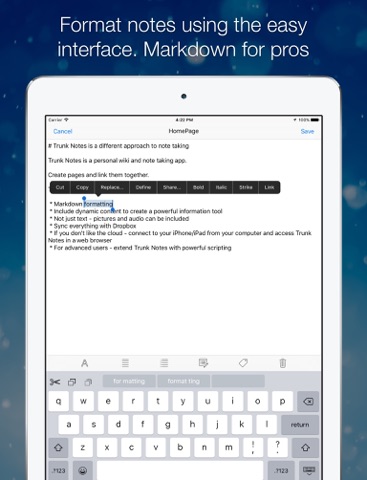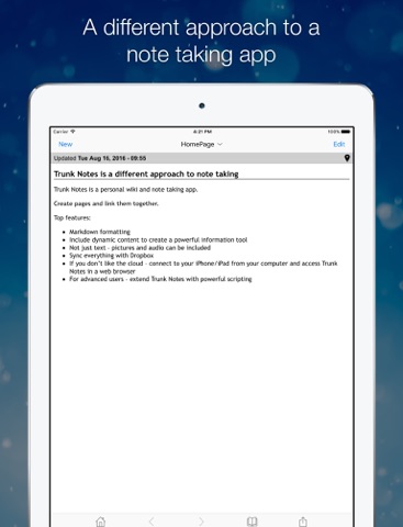 Trunk Notes is a powerful note taking app and personal wiki. Create notes, format notes, and link notes together. Trunk Notes is a different approach to note taking.