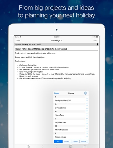 Use Trunk Notes as a simple note taking app - or use its advanced features to create your own personal wiki with dynamic content, images, sound recordings and more.